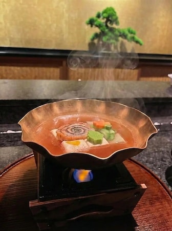 「すっぽん湯豆腐」は、出汁に定評のある「すっぽんの濃厚スープ」を湯豆腐のベーススープにしている。具材には、嵯峨豆腐・うなぎ・地鶏などを使い、茶懐石にオマージュを込めた盛り付けで提供する。