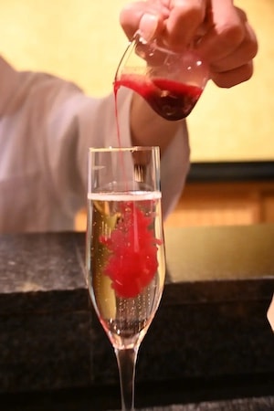 シャンパンにゆっくりと注がれるすっぽんの生き血はとても美しく、特に女性には天然の美容ドリンクとして評価の高いアイテムだ。