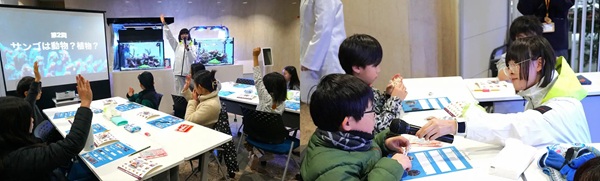 「しながわサンゴ礁ラボ~サンゴが住む海の環境を学ぼう~」の当日は小学生およびその保護者総勢44名が参加。クイズを交えた参加型のインタラクティブ学習では、サンゴの神秘的な生態とともに、地球温暖化による海水温上昇等の環境問題についても学び、子どもたちからも積極的な発言が飛び交った。