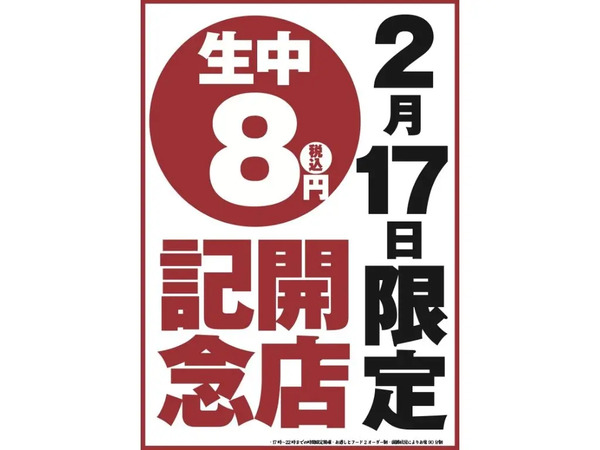 グランドオープン当日は、生ビール何杯飲んでも1杯8円のキャンペーンが開催される。