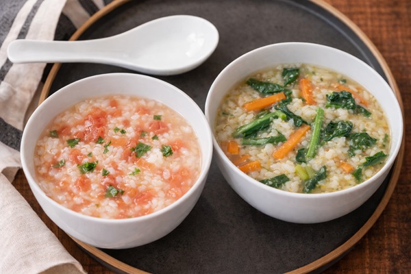 ラインナップは、梅のさっぱりとした風味と大葉の香りが広がる和風仕立ての「梅と大葉~和風出汁仕立て~」と、ほうれん草と人参の彩りと出汁のコクを活かした白湯仕立ての「ほうれん草と人参~コク旨白湯がゆ~」の2種類。