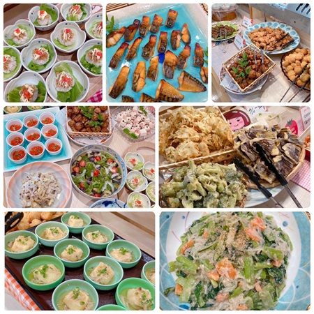 豚肉の野菜巻き、豆腐ハンバーグ(デミ煮込み)、かぶのくず煮、蓮根の酢の物、ピリ辛こんにゃく唐揚げ、大豆ミートグラタン、ジャーマンポテトなど18種類。