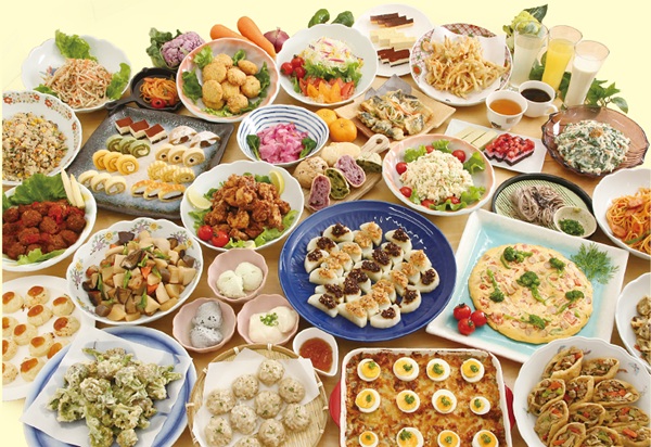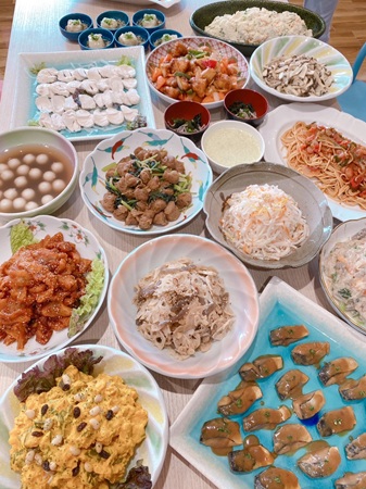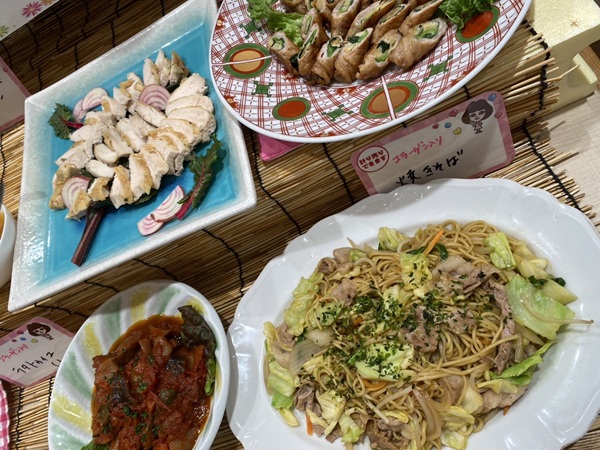 2月の新メニューは、マカロニサラダ、カナッペ、ちらし寿司、焼きそば、菜の花と切り干し大根のみそごま和え、