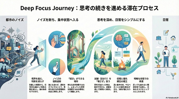 Deep Focus「人に会わずにこもる/逃げる」という使い方は、会話や予定から距離を取りひとりでこもることで、外部ノイズを遮断し、思考を“つなぎ直す”ための時間をつくり出す。