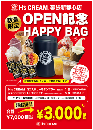 オープンを記念して、サーモタンブラーとスペシャルチケットが入った「HAPPY BAG」¥3,000(税込)が数量限定で登場する。ロゴ入りサーモタンブラー(360ml)は、冷たい飲み物を入れても結露しにくく、あたたかい飲み物を入れても外側が熱くなりにくい、¥3,500相当のタンブラー。スペシャルチケットは、2月13日(金)〜8月31日(月)に使用できる¥700×5枚の計¥3,500分が入って、両方で¥7,000相当となっている。なくなり次第終了となるので、興味のある人は早めに手に入れよう。