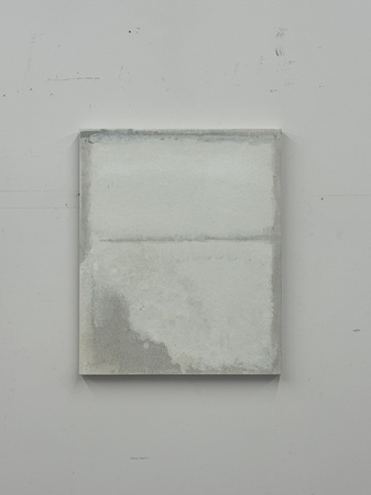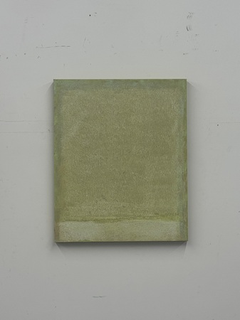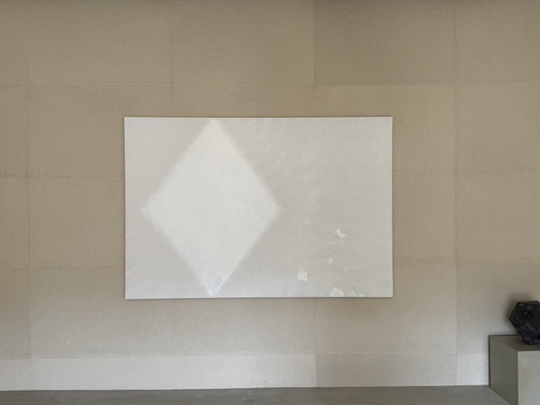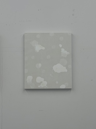ハタノさんが過去に見た風景を思い出すとき、そこには必ず光の記憶があるという。平面作品「ひかり」は、明るい色を用いていても全体のトーンはどこか沈んでいる。それは光を単純な明度としてではなく、闇から光へと移ろう時間そのものとして捉えようとする、ハタノさんの感性の現れである。