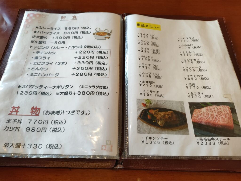 ボリューム満点のメニューと、揚げ物、焼肉、ハンバーグ、カレー、丼もの、うどん・そばなどの豊富なメニュー。