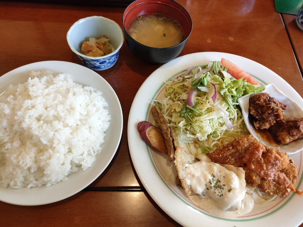 行った日の福寿亭ランチは、白身魚のホワイトソースと油淋鶏、ポークヒレカツでした。