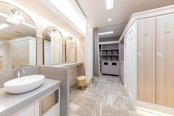 2つ目は、男女別フロア構成による安心感。更衣室・待合フロアでは、ホテルラウンジとも異なる“安心感と可視性”を重視。