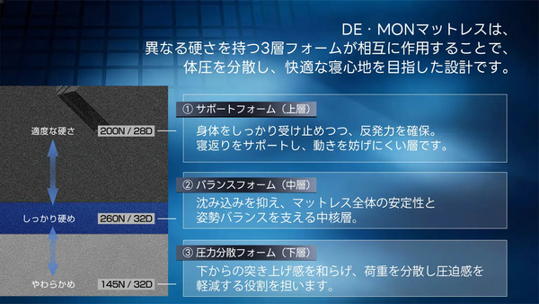忙しい現代人にとって、睡眠は翌日のパフォーマンスを支える重要な基盤。「DE・MON」は今後も、合理性と実用性を軸に、日常に寄り添う寝具づくりを通じて、より良い睡眠環境の選択肢を提供していくとしている。