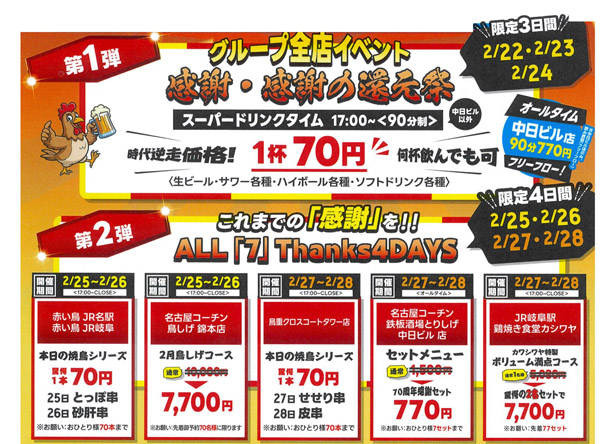 2026年に創業70周年を迎える愛知県名古屋市の「鳥重商店」は、70年分の「ありがとう」を形にするべく、鳥重商店グループの飲食店舗にて「70周年 大創業祭」を2月22日(日)〜28日(土)に開催する。