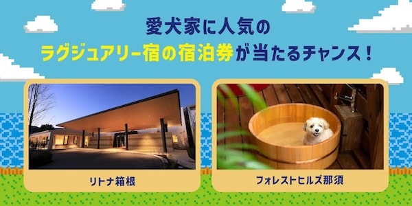 豪華な無料宿泊券に加え、「ワンコnowa」編集部がセレクトしたドッグアイテムや、うちの子クエストに共感した様々な企業提供によるプレゼントが当たる。