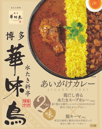 その水たきスープを使い、5年の開発期間を経て誕生したチキンカレーが、この「博多華味鳥あいがけカレー」だ。1箱に「鶏だし香る水たきスープカレー」(1袋)と「鶏キーマ」(1袋)が入っている。