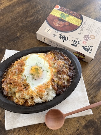 「博多華味鳥あいがけカレー」はアレンジも可能。チーズと卵をトッピングしてオーブンで焼くだけで、北九州ご当地グルメの焼きカレーにアレンジできる。