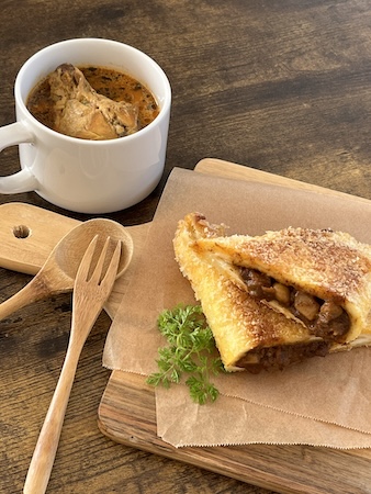 子供でも食べられるアレンジレシピとして、食パンで簡単カレーパン、水たきスープカレーに豆乳を加えてまろやかカレースープ、2品へのアレンジもできる。