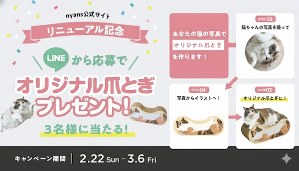 猫の生態を科学的に理解し、「人間の都合ではなく、猫を中心に考える」を掲げるネコ・スタンダード・クリエイト・カンパニー・nyansは、2月22日(日)の「猫の日」に合わせ、創業10年目を記念した3つの「ニャンペーン」を同日より開始。特許技術を用いた新商品「つめまる」の先行予約や、愛猫のイラスト入り爪とぎプレゼントなどを実施する。