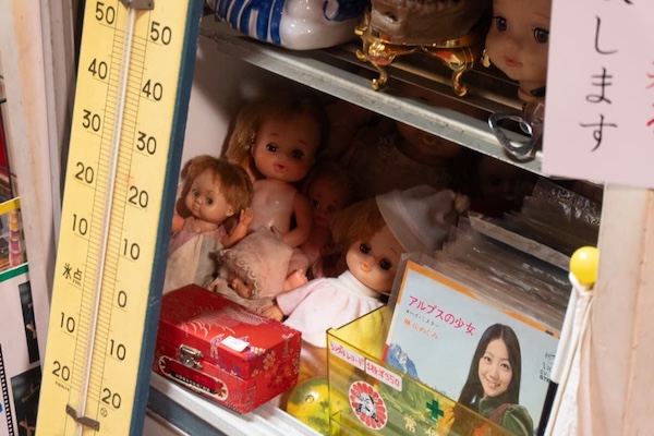 所狭しと並ぶのは、服、アクセサリー、人形、お面、昭和のアイドル雑誌。どこかの子どもが抱いていたであろうクマのぬいぐるみの隣に、どう考えても使い道のない骸骨の模型。