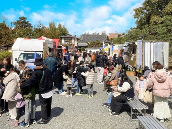 梅園前通路の会場には、地元のキッチンカーをはじめ、各地から隨心院に“美味いもん”が集結。たい焼きやクレープ、ベビーカステラといった定番メニューはもちろん、地元のスイーツ屋も参加してこだわりのグルメ・スイーツがずらりと並ぶ。