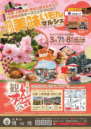 「小町 美味いもんマルシェ」の開催日時は、3月7日(土)・8日(日)の両日ともに9:00から16:30まで。入場は無料だが、小野梅園の入園と隨心院の拝観は有料。