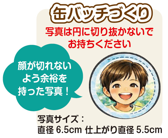 ひとつは有料の缶バッチづくりで、1個につき100円、1人2個まで。参加を希望する場合、缶バッチ用に直径6.5cmの円が入る四角の写真が必要となる。なお写真は円に切り抜かず、仕上がり時に顔が切れないよう周囲に余裕のあるものを持参しよう。