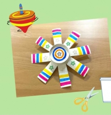 おひさまテラスで体験できるのは、紙コップを使ったコマ作り。シールやマジックでデコレーションし、オリジナルのコマを持ち帰ろう。