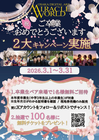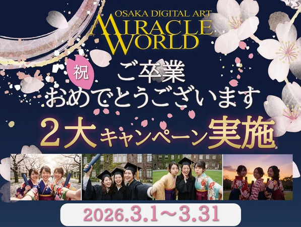 MIRACLE WORLDが、大阪・なんばの体験型デジタルアートミュージアム「MIRACLE WORLD(ミラクルワールド)」にて、3月1日(日)~31日(火)の期間、春の卒業シーズンに合わせた特別施策を実施。