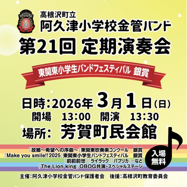3月1日(日)、阿久津小学校金管バンドが「第21回 定期演奏会」(高根沢町教育委員会後援)を行います。