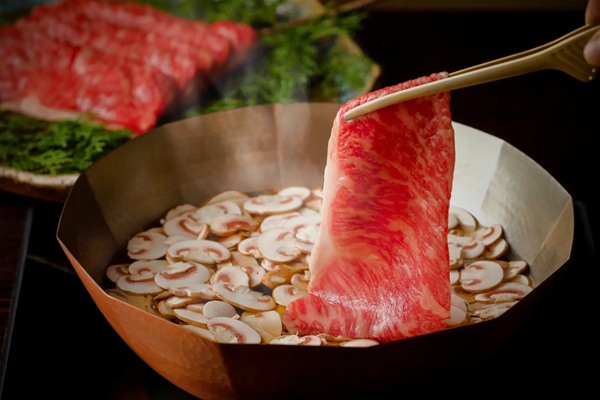「神戸牛 但馬玄しゃぶしゃぶコース」22,000円(税込)は、お出汁を覆い尽くす有機マッシュルーム鍋の中で但馬玄をしゃぶしゃぶ出来るコースとなっている。