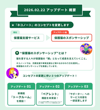 「ネコノート」は2月22日(日)の猫の日で4周年を迎え、サービスコンセプトを従来の「保護猫支援サービス」から、日本初(※3)の「保護猫のスポンサーシップ」へとアップデートする。
