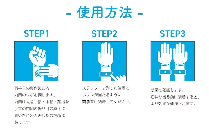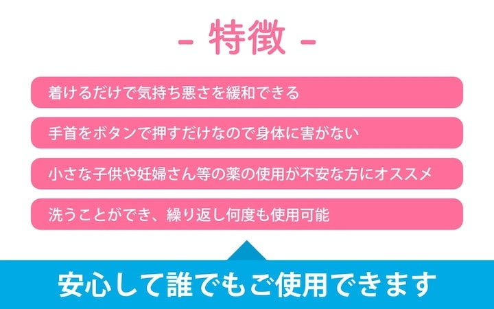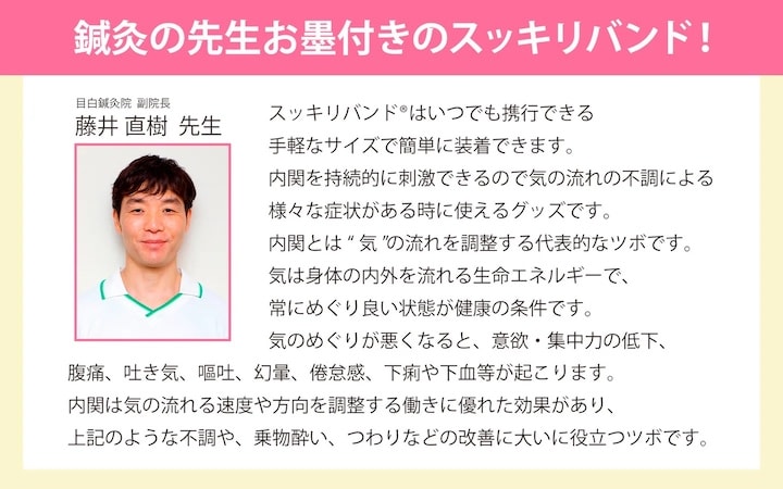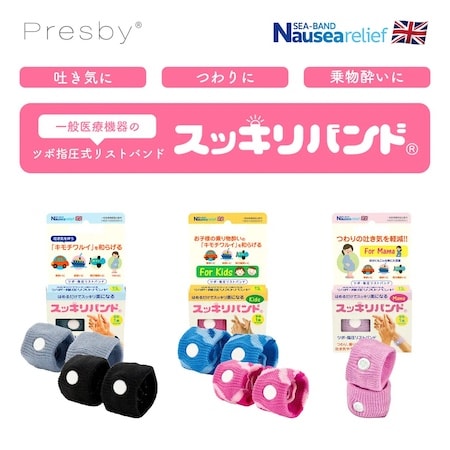 「スッキリバンド」は、手首のツボ「内関(ないかん)」をやさしく刺激することで不快感を軽減する指圧リストバンド。