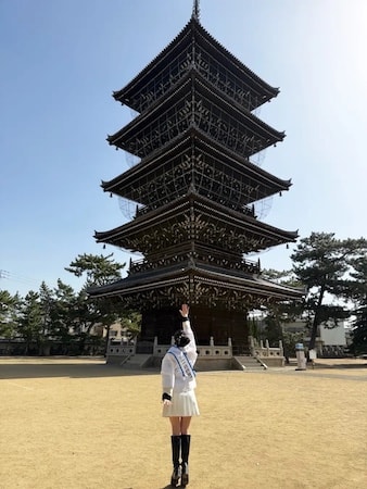 また、信濃氏は五重塔の説明を受け、基壇から相輪まで約43mと国内木造塔で、3番目の高さを誇ることを知り、「私も五重塔に負けないよう、上を目指して頑張ります」と話した。