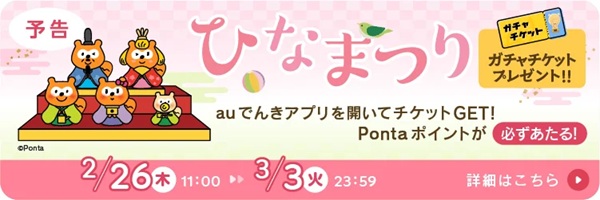 auでんきアプリ起動で最大1,000Pontaポイントが当たる!ひなまつり限定ガチャを実施