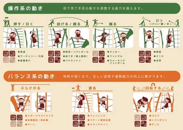1つ目は、12の基本動作の習得。幼少期に体験することで運動能力が高まる「移動系・操作系・バランス系」の12の基本動作が自然と発現するようにデザインされている。
