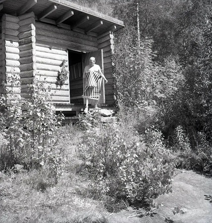 ムーラッツァロの実験住宅(コエタロ)でサウナを楽しむアルヴァ・アアルト、1960年代、Photo: Heikki Havas