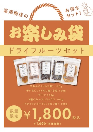人気のドライフルーツを詰め合わせた「ドライフルーツお楽しみ袋」は、50セット限定で1,800円(税込)にて販売。セット内容は、トルコ産の干あんず、小粒の干いちじく、デーツ、3種のレーズンミックス、フィリピン産のドライマンゴーの5種類だ。