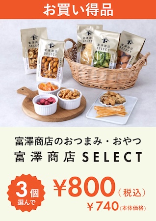 さらにおつまみやおやつにぴったりの「富澤商店SELECT」シリーズも、3個セットの特別価格として800円(税込)で販売される。同シリーズ全品が対象となっており、食べきりやすく手に取りやすいサイズ感が特徴だ。