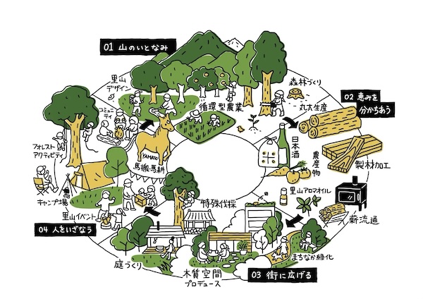 一方、松本平の森林は多様な植生に富み、森が人の暮らしのすぐそばにあり、伝統行事や建築文化にも木が息づき、森と人の営みは長い歴史の中で強く結びついてきた。柳沢林業はこの地域特性に着目し、森の価値を再編集する取り組み「めぐみ、めぐらすプロジェクト」を推進。2021年には、取り組み自体が「未来を育む持続可能な地域デザイン」として評価され、グッドデザイン賞を受賞した。
