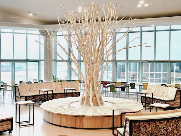 江戸川学園取手中・高等学校では、校内のコミュニティーホールに、天然木のシンボルツリーと、色とりどりの薪のベンチ、個性的な木目の表情を持つテーブルを設置した。