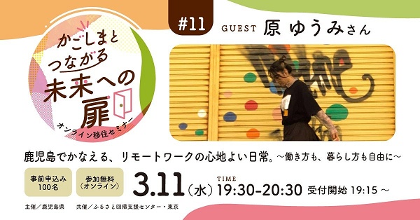 みらいワークスは、3月11日(水)に鹿児島県から受託した事業の一環で、オンライン移住セミナー「かごしまとつながる未来への扉」を開催する。