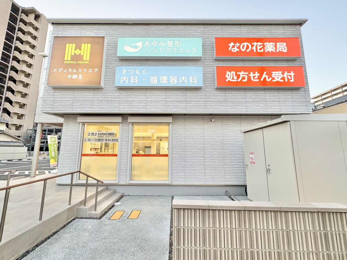 入居しているのはまつもと内科循環器内科、なの花薬局中納言店、あゆみ整形ハンドクリニック。