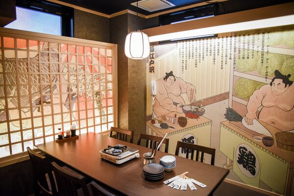 「ちゃんこ江戸沢」の店内は、和を基調とした木目の優しさと畳が香るモダンな雰囲気。店内に描かれている相撲絵は、日本の伝統文化に触れながら食事を楽しめると海外から訪れる人々にも大変人気だという。大小さまざまな個室を用意しているため、プライベートな食事会にも最適だ。