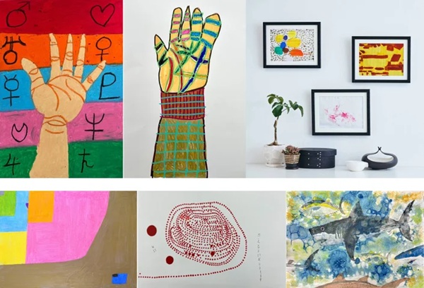 <下段>左:外園要「僕の世界」(カポノジーコ) /中央:鶴川 弘二「タイトルなし」(すたじおぽっち)/右:鮫島龍馬「海の中に住むサメの仲間たち」(アートスクールありんこ)