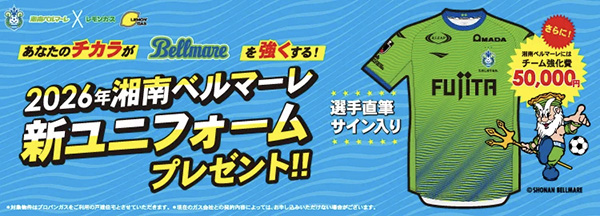 湘南ベルマーレ ユニフォーム プレゼントキャンペーンでは、湘南ベルマーレ 2026年シーズンFP1stユニフォームに、クラブ所属の好きな選手1名の直筆サインを入れてプレゼント。また、「湘南ベルマーレ」へのチーム強化費として、期間中の契約件数1件につき50,000円を支援する内容だ。