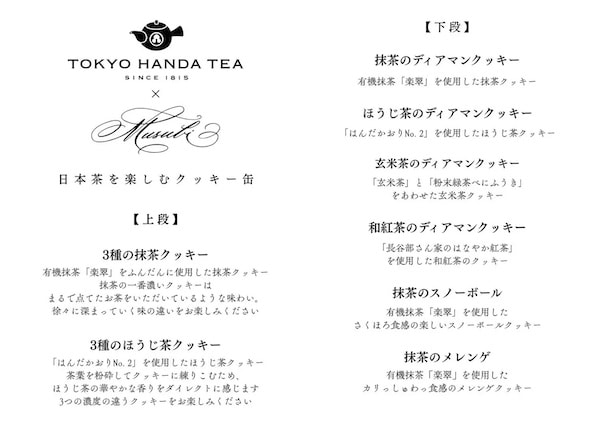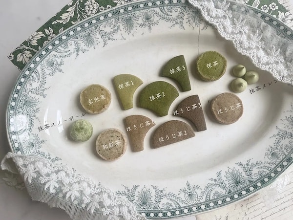 「3種の抹茶クッキー」と「抹茶のディアマンクッキー」は、有機抹茶「楽翠」を使用。「3種のほうじ茶クッキー」と「ほうじ茶のディアマンクッキー」は、ほうじ茶「はんだかおりNo.2」が使われている。
