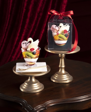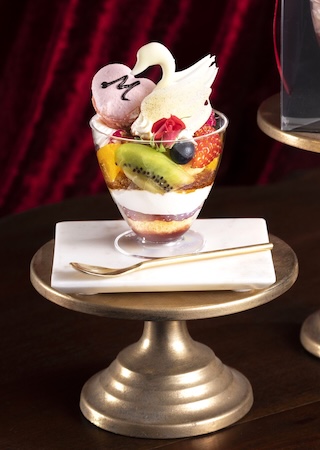 メニューの監修は、ロリータファッションの第一人者・青木美沙子さん。凜とした美しさのチョコレートのスワンをはじめ、青木さんのイニシャル「M」を施したベリーマカロン、紅白の食用花を添え、さらにオレンジ、キウイ、ブルーベリー、苺など、色とりどりのフルーツが贅沢に盛り付けられている。自宅でのティータイムや、大切な人へのギフトとしても最適な、どこから見ても愛らしい宝石箱のような一品だ。