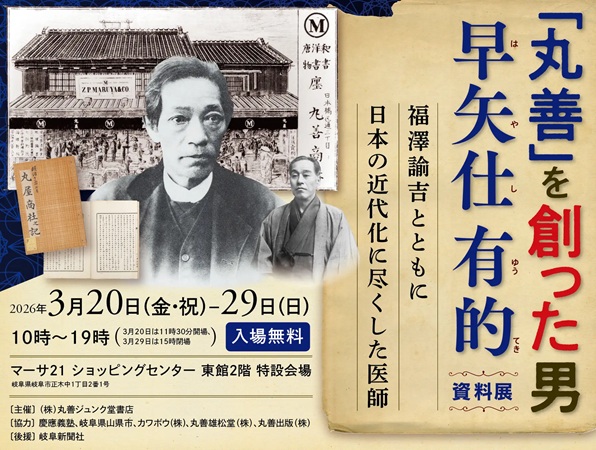 丸善ジュンク堂書店は、丸善の創業者である早矢仕有的(はやし・ゆうてき、1837-1901)の没後125周年に際し、3月20日(金)~29日(日)の期間、岐阜市の商業施設「マーサ21 ショッピングセンター」東館2階特設会場にて「『丸善』を創った男早矢仕有的資料展」を開催する。