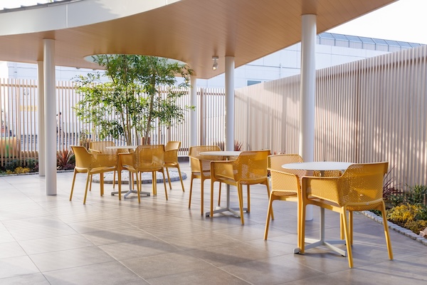 テラスにはトネリコの木を植え、地域との縁が長く続くことへの願いを込めた。ベンチやテーブルも設置され、買い物の後にもゆったり過ごせる。