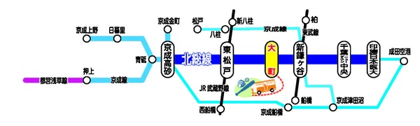 大町駅までは、押上駅より約25分、東松戸駅より約3分、千葉ニュータウン中央駅より約13分、京成高砂駅より約13分、新鎌ヶ谷駅より約2分。
