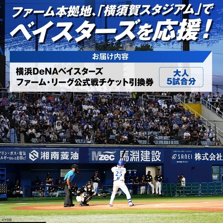 「横須賀スタジアム開催 ファーム・リーグ公式戦チケット引換券」(大人5試合分)は、横須賀スタジアムで開催されるファーム・リーグ公式戦チケット引換券。追浜駅からスタジアムまでの道のりも、横浜DeNAベイスターズ色に染まった街並みを楽しむことができる。