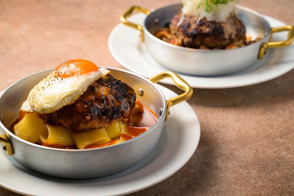 器の底にパスタ、その上に国産ミンチを使用した肉厚ハンバーグを重ね、4種類のソースから好みのものを選択。全体を混ぜ合わせることで、パスタ・肉・ソースが一体となり、食べ進めるごとに味わいが完成していく“混ぜて楽しむ”新しい食体験を届ける。ソースごとに最適なパスタ形状を採用することで、混ぜ心地や食感にもこだわったそう。